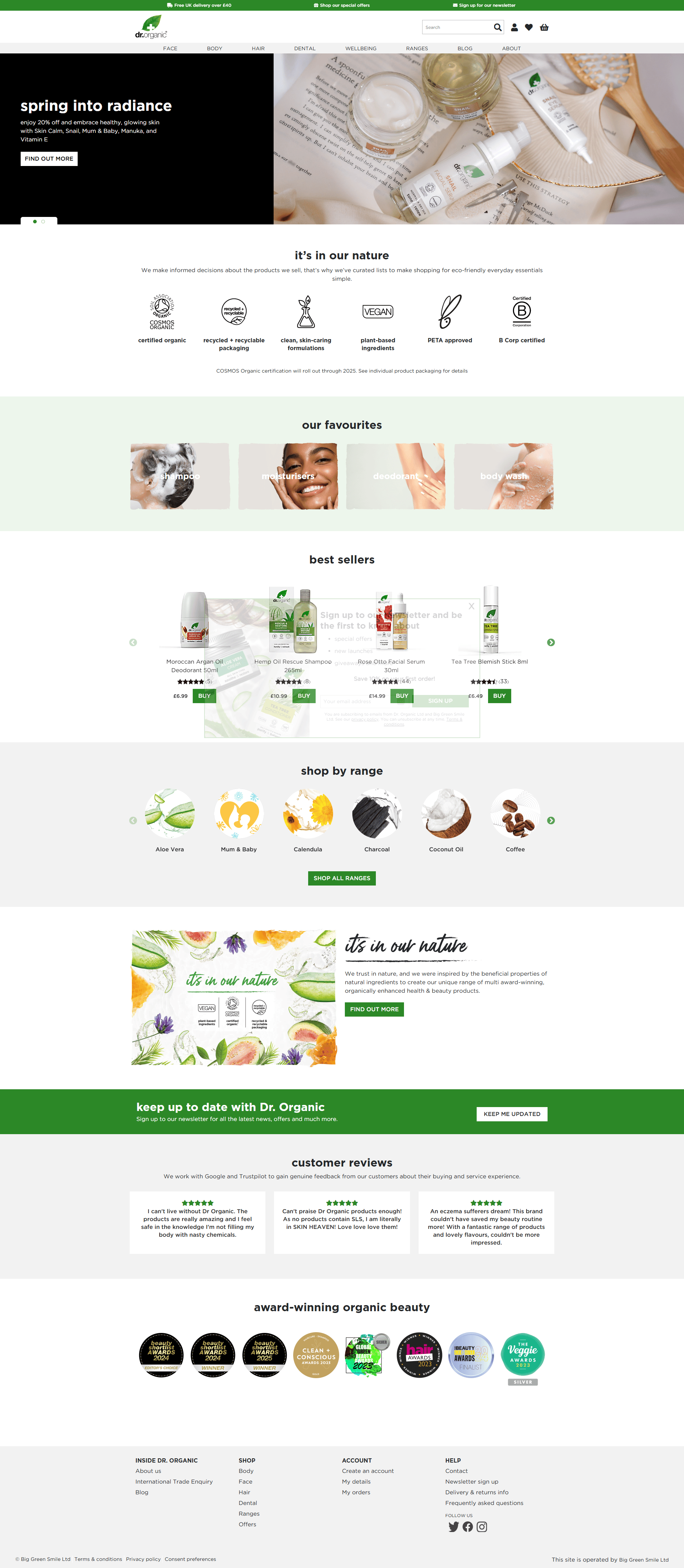 Dr. Organic doesn't use a pop-up trigger on their homepage. The sign-up form lives in the middle of the page, buried between product carousels and "our favorites" sections.