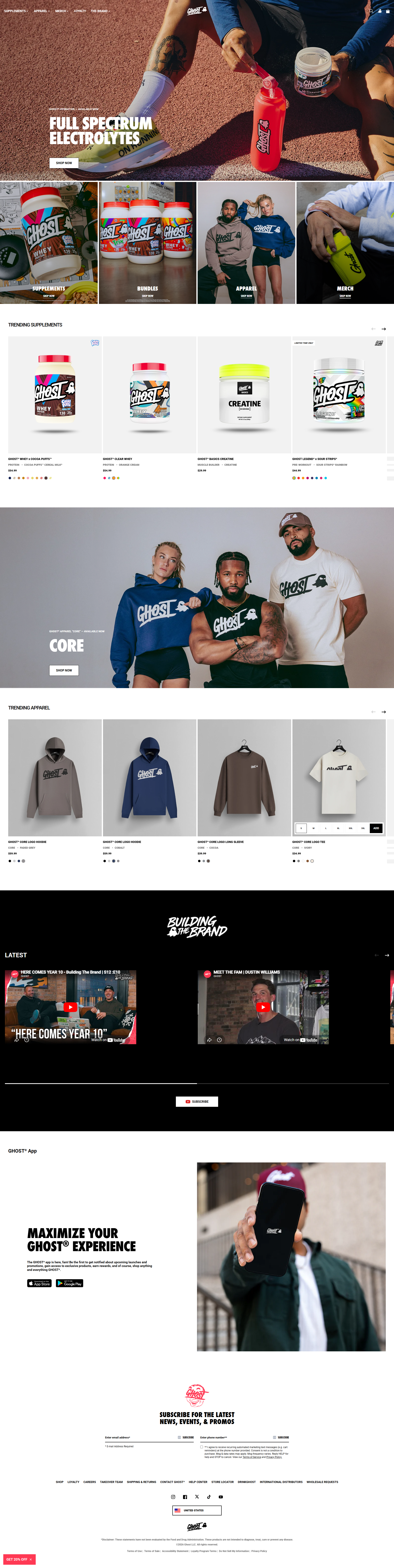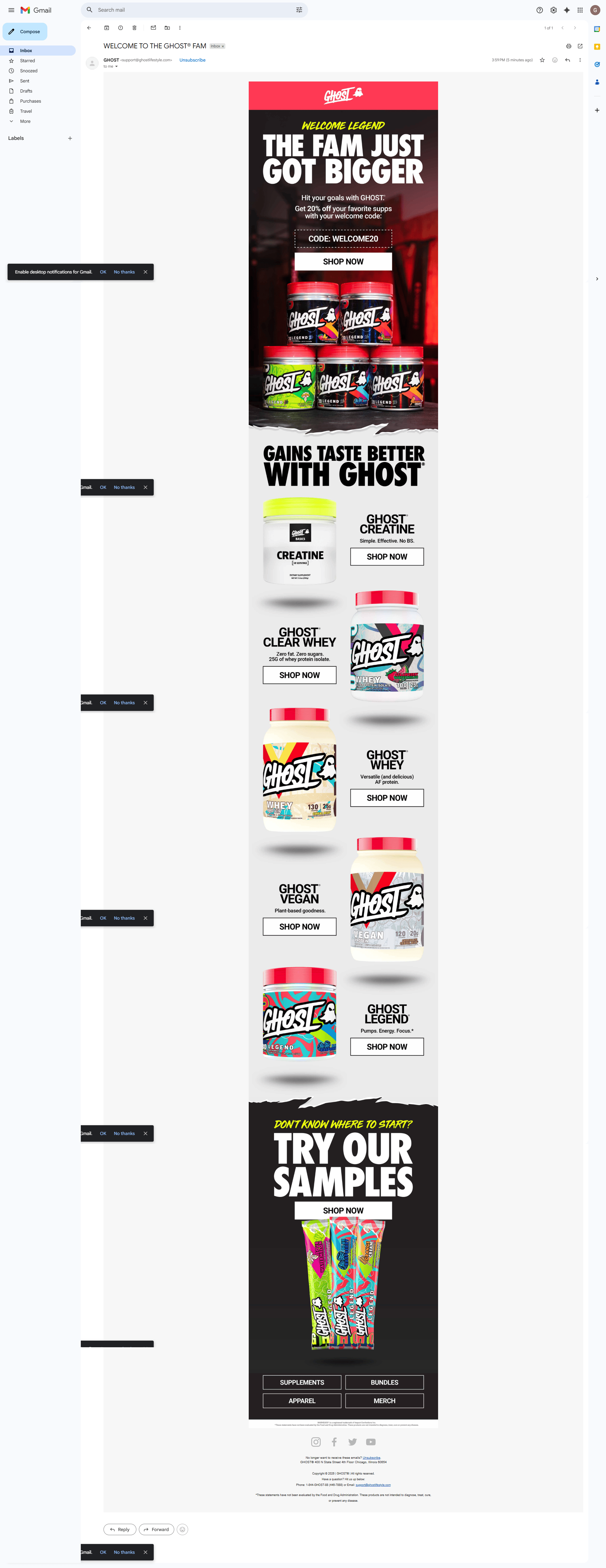 Subject line: "WELCOME TO THE GHOST FAM." Preview: "Get 20% off your favorite supps and hit your goals with GHOST."