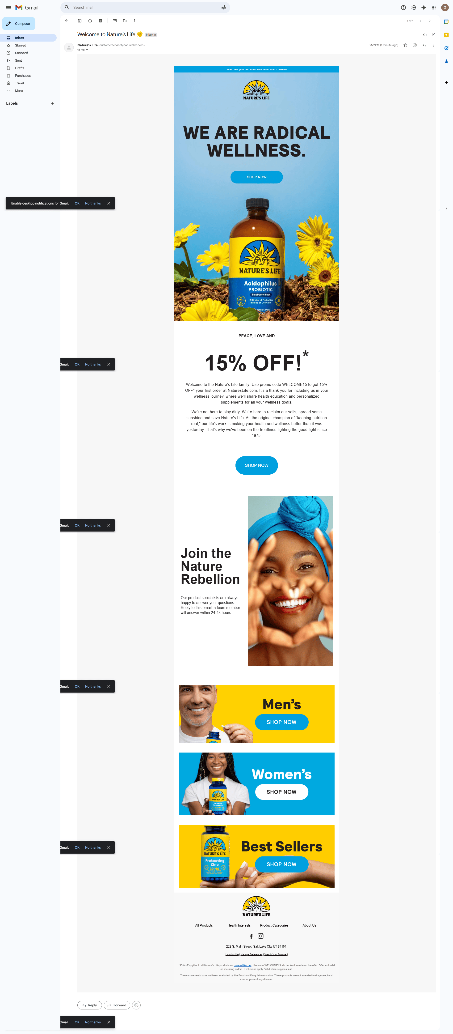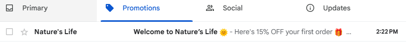 The subject line itself is solid: "Welcome to Nature's Life ☀️ Here's 15% OFF your first order 🎁" - clear, benefit-forward, emoji-accented. But it can't help if the subscriber doesn't see it.