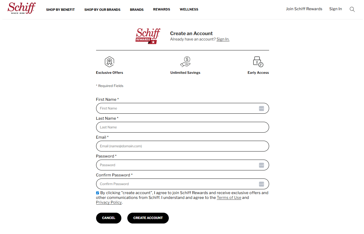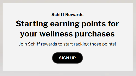 There's a "Schiff Rewards" block buried in the middle of the homepage. The copy reads: "Starting earning points for your wellness purchases."