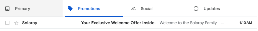 The welcome email arrived at 1:10 AM. That's a 9-minute delay. Invesp's data shows 74% of subscribers expect a welcome email immediately, but only 50% of brands actually send one on the spot. Solaray is in the slow half. At 9 minutes, the subscriber's attention has already moved on and the discount they were expecting is buried in a tab they're not watching.