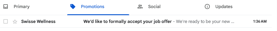 For a pop-up that promises "wellness tips and tidbits direct to your inbox," landing in Promotions undercuts that promise before the subscriber reads a single word.