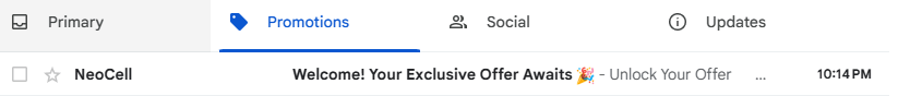 74% of new subscribers expect a welcome email the moment they sign up. NeoCell arrives 11 minutes late, in the wrong tab, with a subject line that reads like a promo blast rather than a personal welcome.