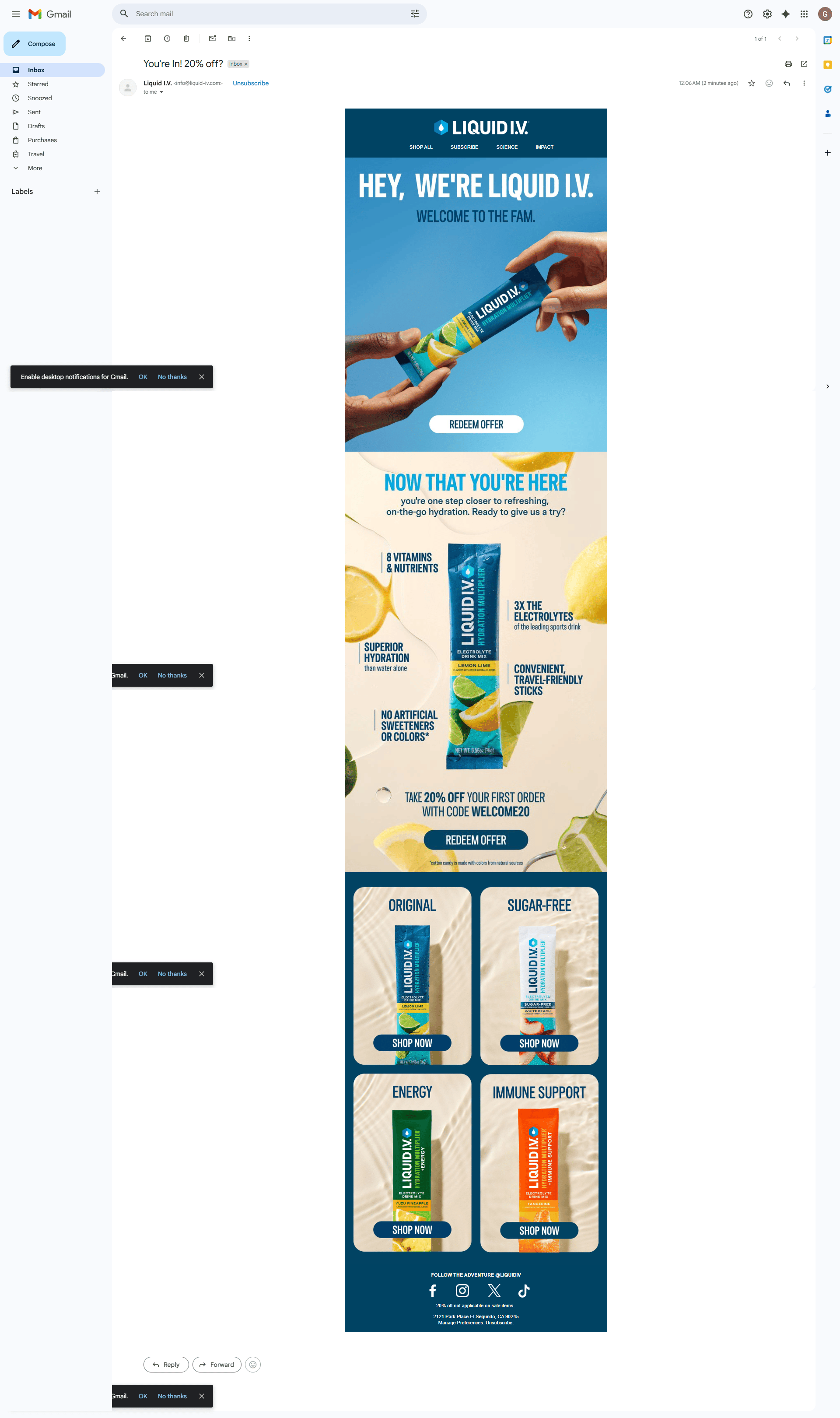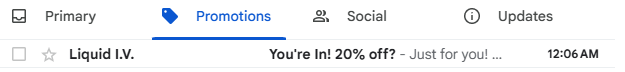 Subject line: "You're In! 20% off?" The question mark is doing no favors. It reads uncertain, like even Liquid I.V. isn't sure you got the deal. Strong subject lines make statements, not ask questions.